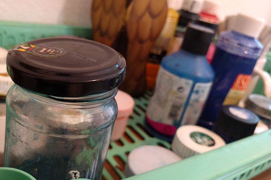 Pinceles, lienzos de seda y recipientes con pintura, rotulados con braille,