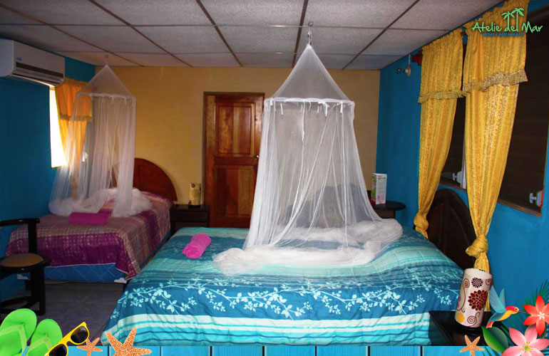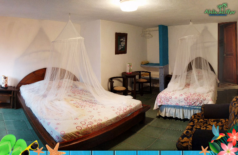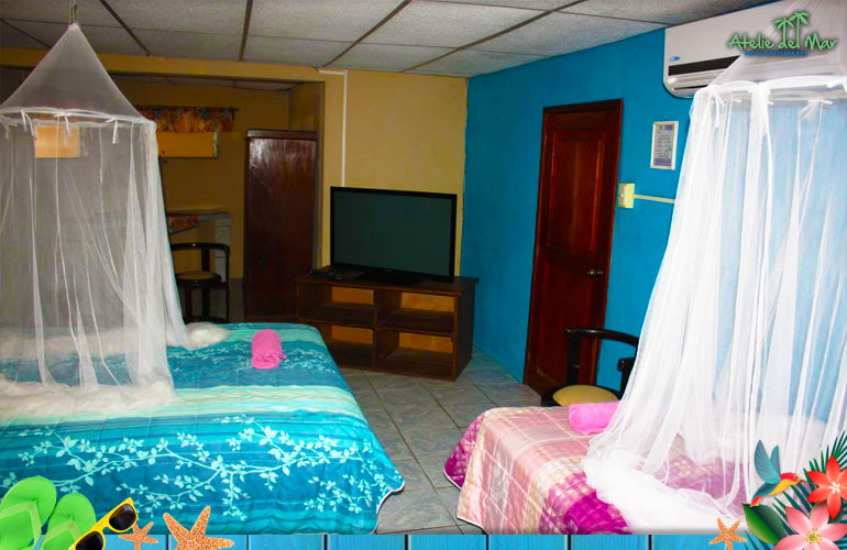 A room with one double bed and one single bed, for two or three persons, with air conditioning, television and private bath. Our rooms are comfortables, not luxuries, but with all that you need in the heat we have in Monte Rico.